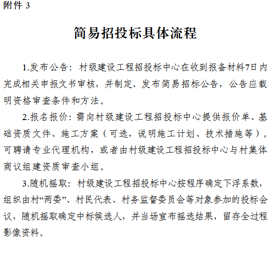 (1)單項工程預算審核在30萬元以下的,可通過詢價、邀標、競爭性談判、競爭性磋商、簡易招投標(具體流程詳見附件3)、公開招投標等任意一種方式確定有資質的施工方,由村(社區(qū))自行組織招投標。