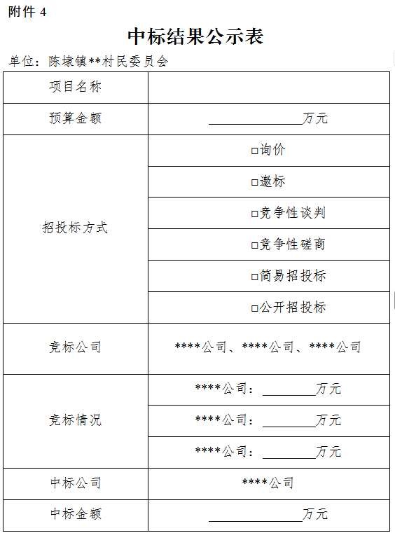在福建省基層小微權力監(jiān)督平臺、村務公開欄公開公示。公示內(nèi)容:施工(承建)合同、《陳埭鎮(zhèn)村級建設工程項目竣工驗收報告單》(附件7)、竣工結算書,時間不少于3日。