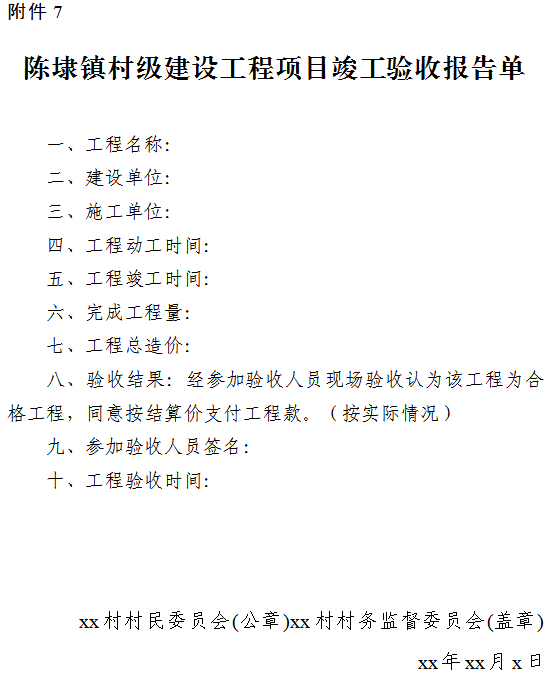村級建設工程項目完工后,村集體應及時組織村(社區(qū))“兩委”成員、駐村干部、施工單位負責人、設計單位、監(jiān)理單位、地質勘察等參建單位進行竣工驗收,填寫《陳埭鎮(zhèn)村級建設工程項目竣工驗收報告單》(附件7)。