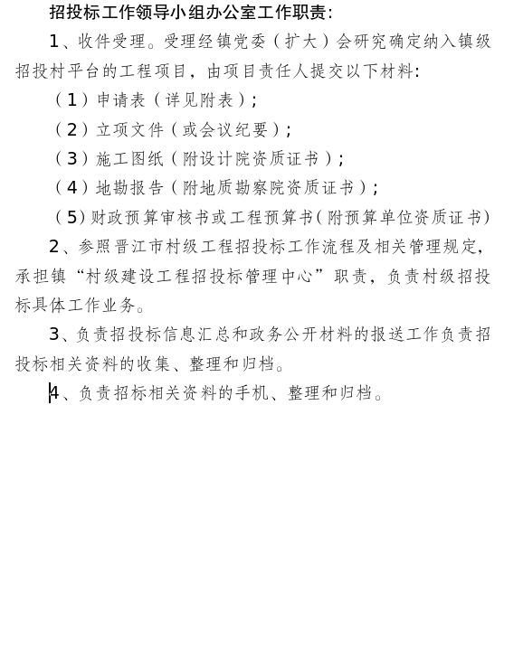 1.統(tǒng)一受理鎮(zhèn)、村建設項目招投標的申請,協(xié)助指導項目業(yè)主制定招標文書;