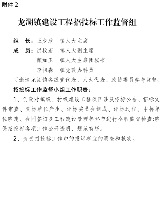 2.龍湖鎮(zhèn)建設工程招投標工作監(jiān)督組