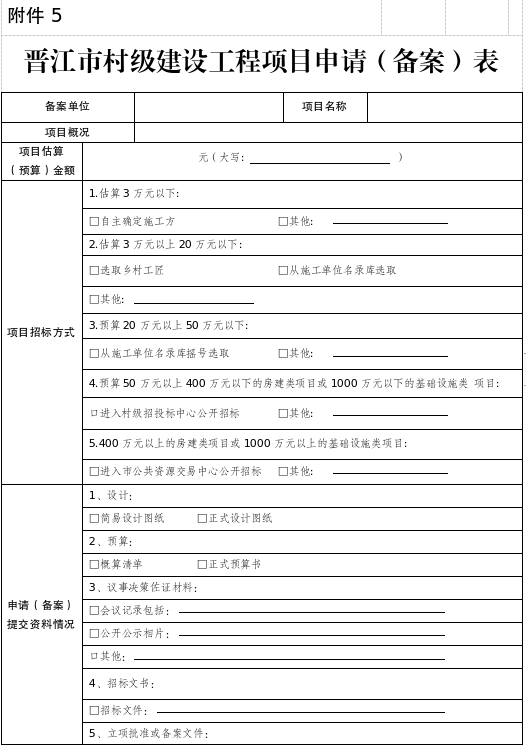 (4)單項工程造價預算審核在3萬元以下的村級零星工程項目,由村“兩委”集體研究后,填報《晉江市村級應急、零星工程項目申請表》(附件6),報鎮(zhèn)駐村干部、包村領(lǐng)導同意簽字后實施(3日內(nèi)完成),并及時將《晉江市村級應急、零星工程項目申請表》(附件6)在福建省基層小微權(quán)力監(jiān)督平臺、村務公開欄公示。單項工程造價預算審核在3-30萬元(含3萬元、不含30萬元),由村“兩委”集體研究,通過詢價、邀標、競爭性談判、競爭性磋商、簡易招投標、公開招投標等任意一種方式確定有資質(zhì)施工方。單項工程造價預算審核在30-50萬元(含30萬元、不含50萬元)工程建設項目,由村“兩委”集體研究,決議以簡易招投標或公開招投標等任意一種方式確定有資質(zhì)施工方。